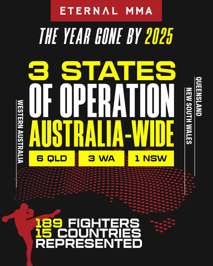 Eternal MMA delivered 10 UFC Fight Pass shows in 2025, broadcast to 195+ countries globally. We operated across three Australian states, with thousands of fans attending each event.