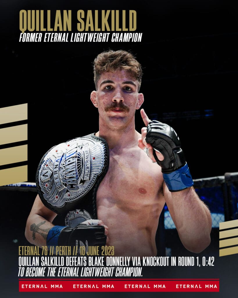 Three straight finishes later, a mix of submissions and knockouts, proved his versatility and power. On June 10, 2023, in front of his hometown crowd in Perth, Australia, Quillan delivered a spectacular 42-second knockout over Blake Donnelly to capture the Eternal Lightweight Title.